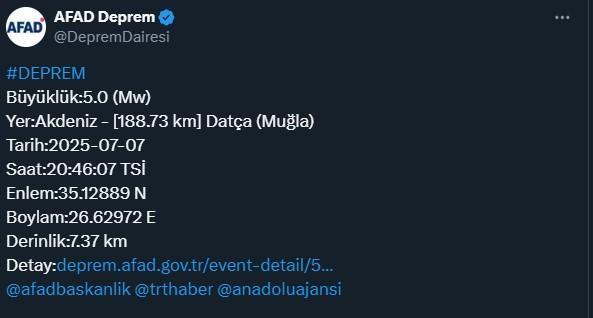 Afet ve Acil Durum İdaresi Başkanlığı, Akdeniz’de Muğla Datça açıklarında saat 20.46’da 5 büyüklüğünde bir zelzele meydana geldiğini açıkladı.