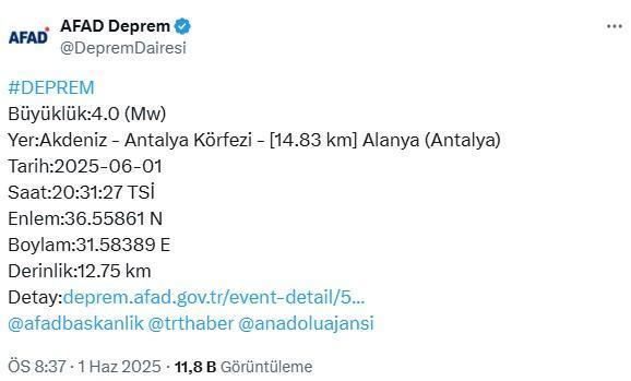 Antalya‘nın Alanya ilçesi açıklarında 4 büyüklüğünde sarsıntı gerçekleşti.