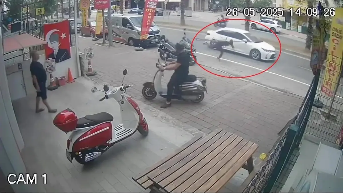 Antalya’nın Muratpaşa ilçesinde omzunda demir borularla yolda yürüyen vatandaş, boruların arabaya çarpması sonucu bir anda kendini yerde buldu. Yaşadığı olaya bir müddet mana veremeyen şahıs, akabinde ayağa kalkıp etrafına bakındı. O anlar güvenlik kamerasına yansıdı.