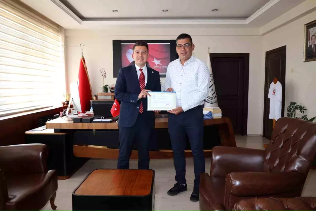 Karacasu Kaymakamı Mehmet Gündoğdu, Bahçeköy Mahalle Muhtarı’nın orman yangınlarına karşı ferdi uğraşlarıyla oluşturduğu acil müdahale noktaları için kendisine teşekkür evrakı takdim etti.