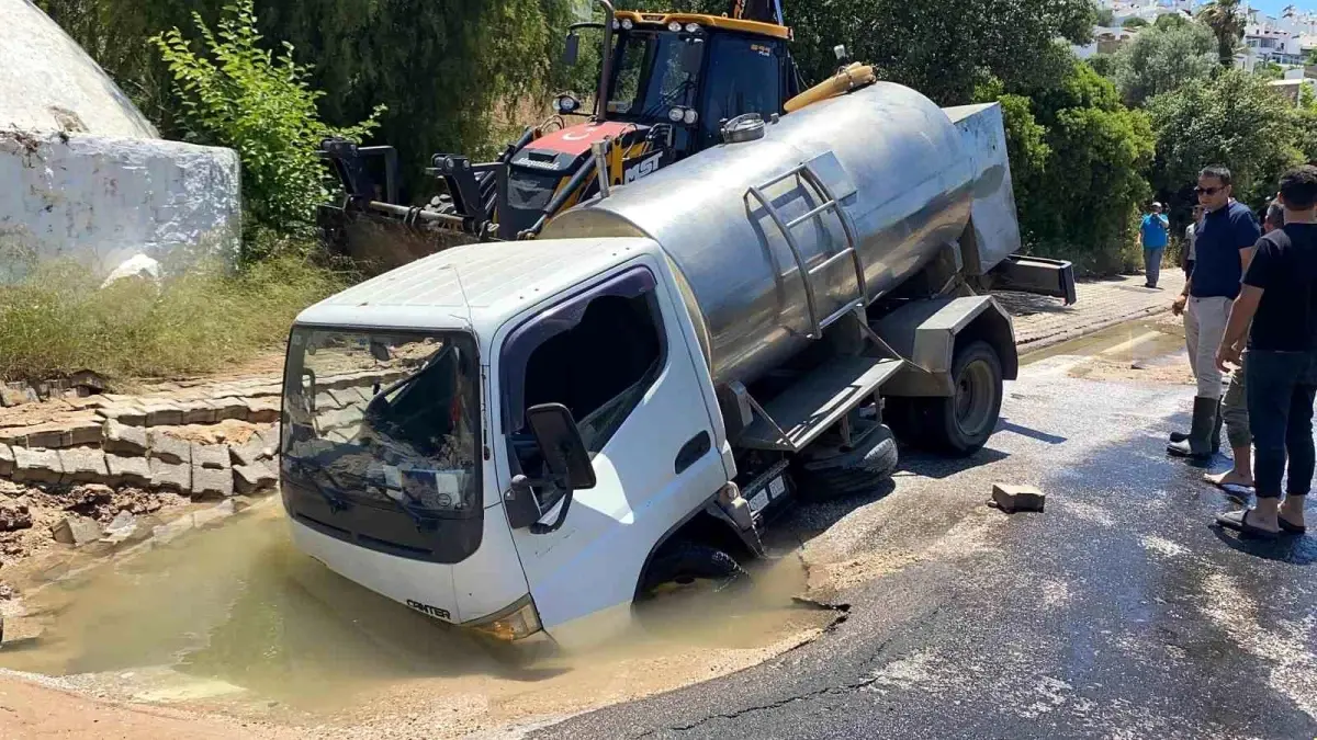 Muğla’nın Bodrum ilçesinde ana isale çizgisinde patlama meydana gelirken, patlağın olduğu noktada tanker çukura düşerek mahsur kaldı.