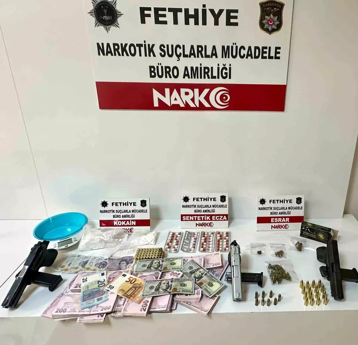 Edinilen bilgiye göre, Muğla Emniyet Müdürlüğü Narkotik Suçlarla Mücadele Şube Müdürlüğü ile İstihbarat Şube Müdürlüğünce tarafından uyuşturucu ile çaba kapsamında gerçekleştirilen operasyonda yüklü ölçüde uyuşturucu husus, silah ve para ele geçirildi. Fethiye Narkotik Hatalarla Gayret Ofis Amirliği ile İstihbarat Şube gruplarının yürüttüğü çalışma sonucunda bin 256 gram esrar, 101 gram kokain, 49 adet sentetik ecza, 12 kök Hint keneviri, 3 adet ruhsatsız tabanca, 74 adet fişek, cürümden elde edildiği bedellendirilen 132 bin 800 TL, 700 dolar, 220 pound ve 70 euro para ele geçirildi.