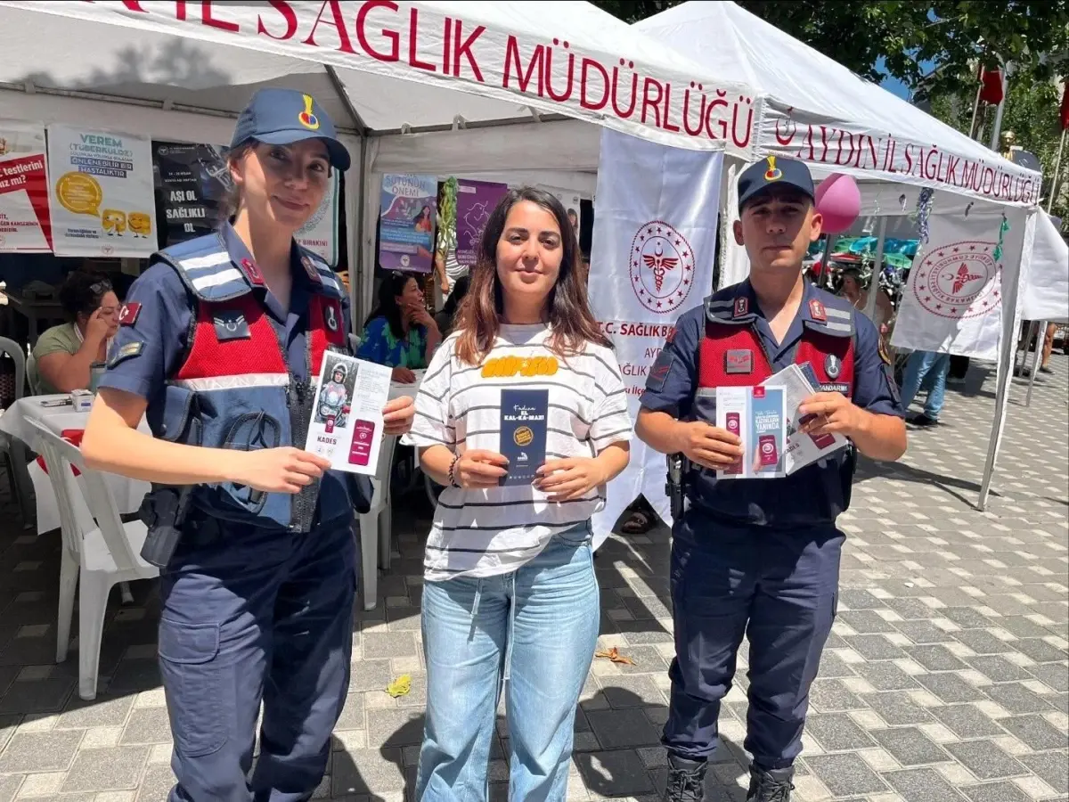 Aydın’ın Kuşadası ilçesinde stant açan jandarma takımları hem teşkilatı tanıttı hem de bayan ziyaretçilere KADES uygulamasını anlattı.