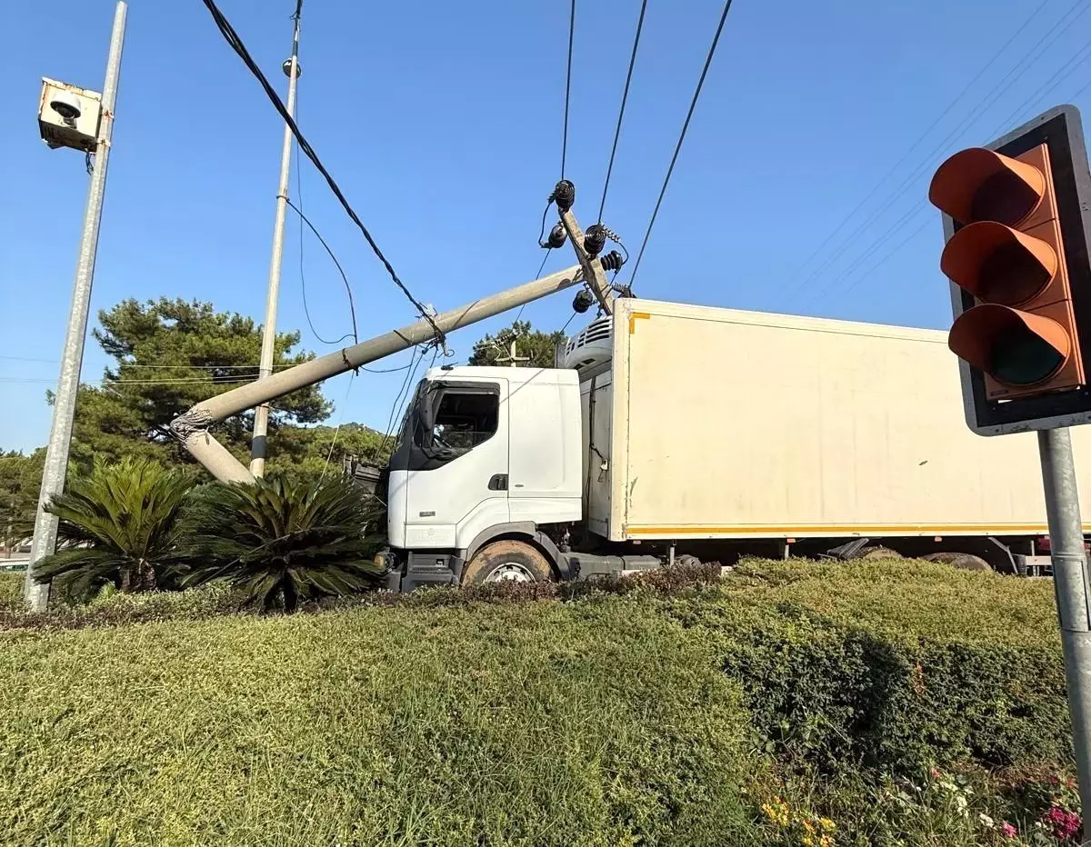 Muğla’nın Marmaris ilçesinde frenleri tutmayan kamyon refüje çıkarak aydınlatma direğine çarparak durabilirken, direk ikiye bölündü.