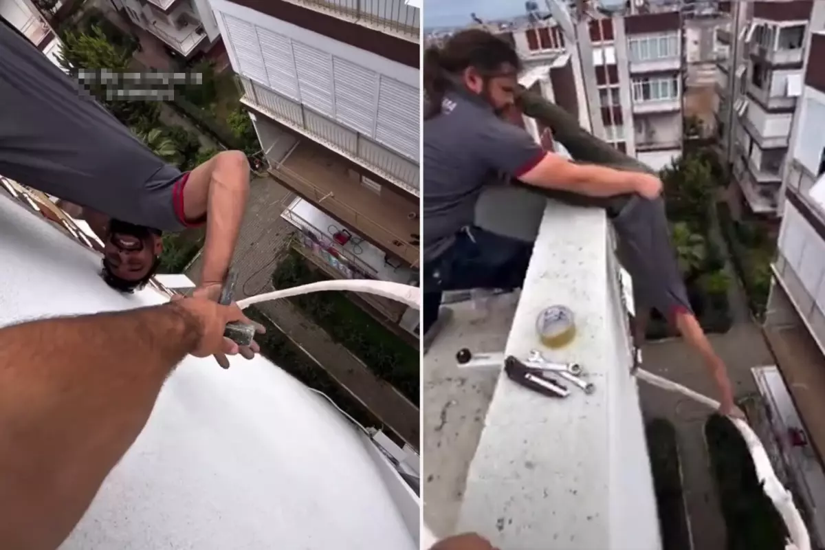Antalya‘da skandal bir olay yaşandı. 3 kişi, klima montajı yapmak için bir binanın çatısına çıktı. Çalışanlardan biri çatıdan baş aşağı sarkıp çalışmaya başladı.