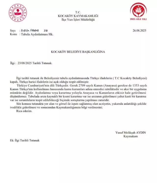 Yazıda şu sözlere yer verildi: “Belediyeniz tabela aydınlatmasında Türkçe tabirlerin (T.C Kocaköy Belediyesi) kapalı, Türkçe harici sözlerin ise açık olduğu tespit edilmiştir.